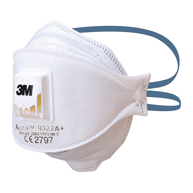 The 3M 9322A+ is a disposable, flat-fold particulate respirator with FFP2/P2 certification, designed for protection against dusts, mists, and fumes in industrial environments