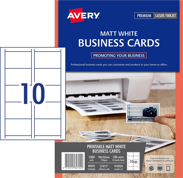 Available in single-sided printable matt white card in a size of 90 x 52mm with 10 cards per sheet in a bulk pack of 100 sheets, perfect for frequent users who need a lot of business cards or for those creating cards for different people in the office