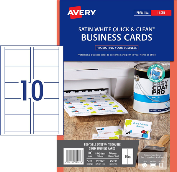 Premium double-sided printable business cards from Avery in 85 x 54mm format guarantee excellent print quality as the satin, ultra-white 270gsm material is specifically designed for colour laser printing.They have unique Quick & Clean technology for fast separation and smooth edges which gives a totally professional look and feel plus on the back of the business card, additional information such as opening hours, directions and services can be added.