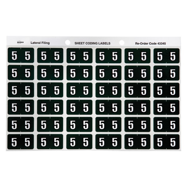 There are 180 dark green Numeric 5 Side Tab Colour Coding Labels in a pack with a size of 25 x 38mm ready to stick straight onto the side tab of your Avery Lateral Files.