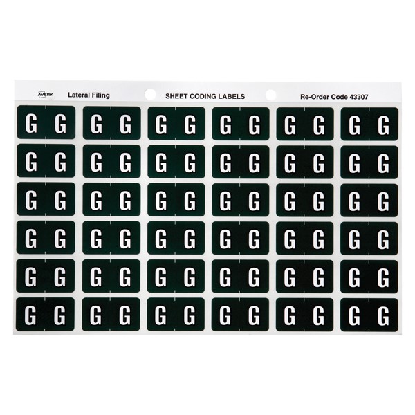 There are 180 dark green Alphabetical G Side Tab Colour Coding Labels in a pack with a size of 25mm x 38mm ready to stick straight onto the side tab of your Avery Lateral Files.