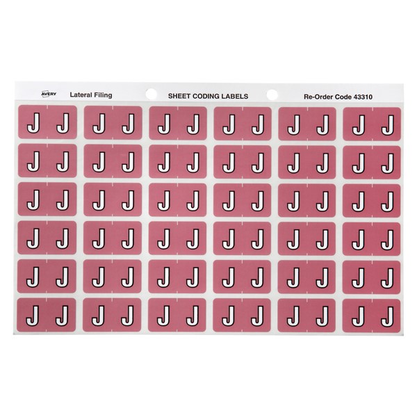 There are 180 mauve Alphabetical J Side Tab Colour Coding Labels in a pack with a size of 25mm x 38mm ready to stick straight onto the side tab of your Avery Lateral Files.
