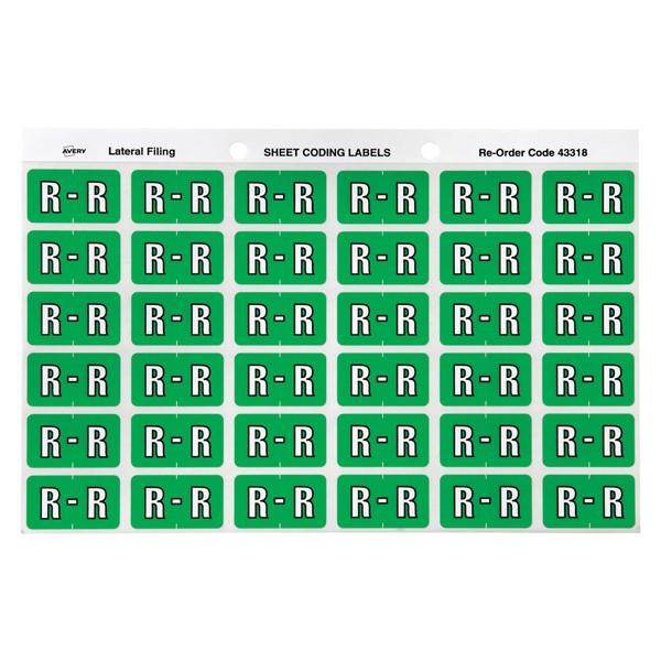 There are 180 light green Alphabetical R Side Tab Colour Coding Labels in a pack with a size of 25mm x 38mm ready to stick straight onto the side tab of your Avery Lateral Files.