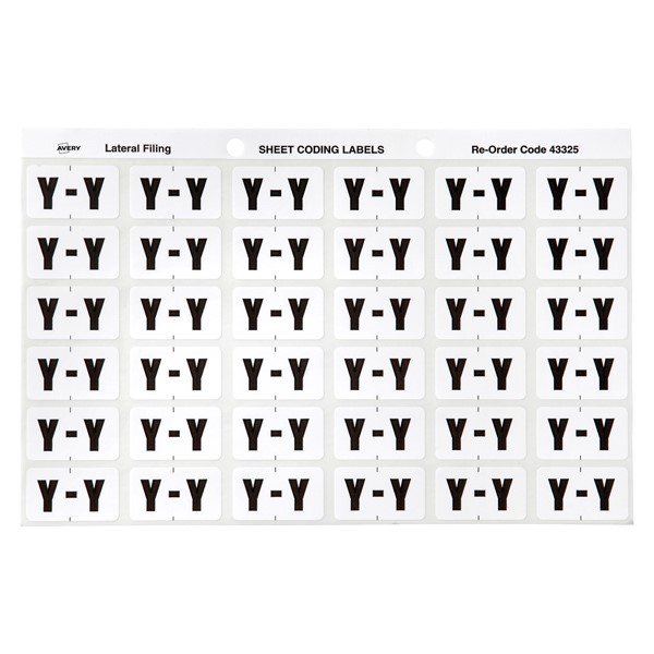 There are 180 white with grey print Alphabetical Y Side Tab Colour Coding Labels in a pack with a size of 25 x 38mm ready to stick straight onto the side tab of your Avery Lateral Files.