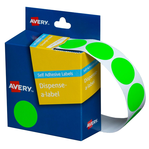 Avery Dispenser Dot Stickers 24mm Fluro Green 350 Pack (Sold as Each, 5 in a Box) Adelaide Direct Stationers