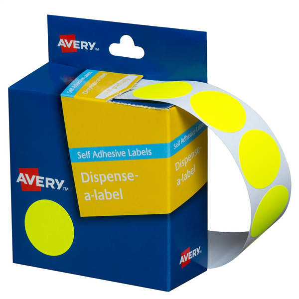 Avery Dispenser Dot Stickers 24mm Fluro Yellow 350 Pack (Sold as Each, 5 in a Box) Adelaide Direct Stationers