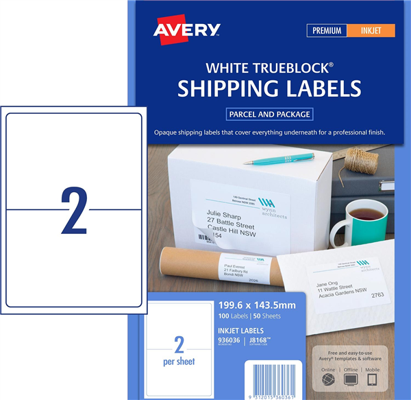 Avery J8168 Inkjet Shipping Labels 199.6x143.5mm 50 Pack Adelaide Direct Stationers