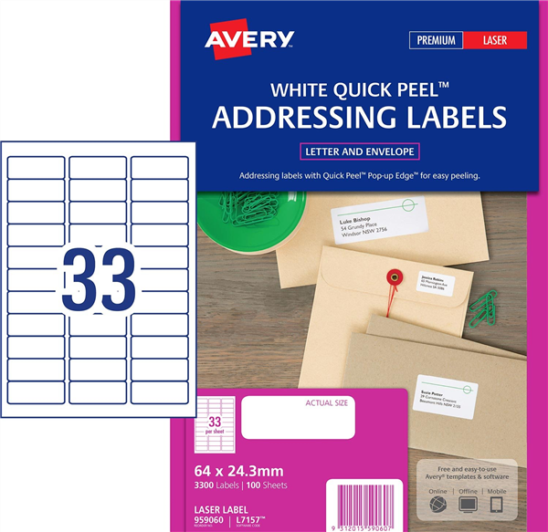 The label format is 64 x 24.3mm with 33 labels per sheet and is an ideal size for applying to DL envelopes