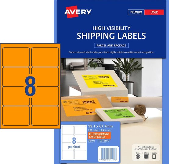 Avery L7165FO Shipping Labels 8UP Fluoro Orange 25 Pack Adelaide Direct Stationers