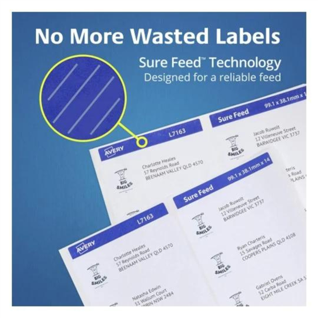 Only Avery address labels offer our Sure Feed feature that delivers a more reliable feed through your printer and prevents jams and misalignments