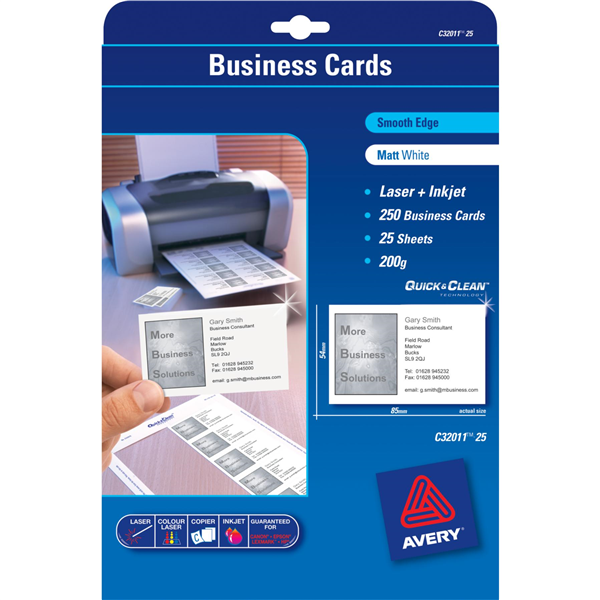 Premium printable business cards from Avery in 85 x 54mm format guarantee excellent print quality as the matt, ultra-white 200gsm material is specifically designed for inkjet and laser printing