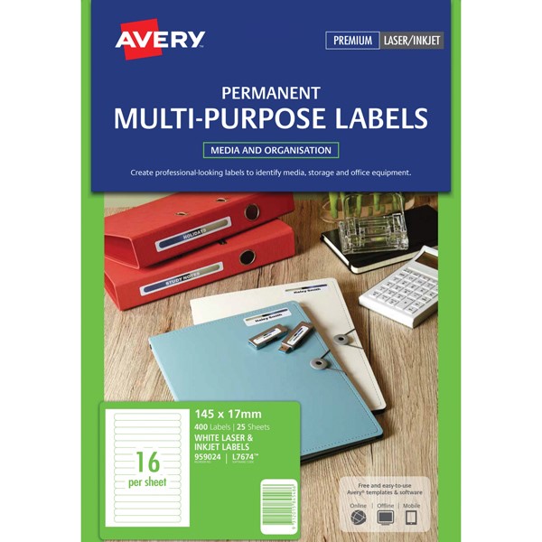 • Avery Permanent Multi-purpose Labels are designed for many different uses around the home or office and come in a range of sizes to suit your labelling needs
