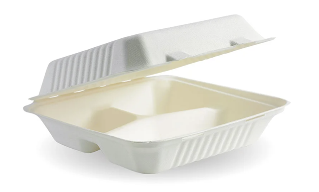 Our 9x9x3" 3-compartment white bagasse clamshell containers are an eco-friendly alternative to plastic takeaway containers.