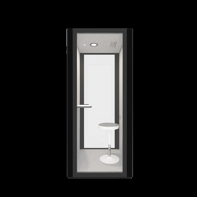 B.Quiet Single Person Acoustic Pod Overall Size: 2245mm H x 1030mm W x 1030mm D Internal Size: 2165mm H x 910mm W x 910mm D Exterior Finish - Black Powder Coat Interior Finish GP18 Dark Grey Eco Panel Desktop Finish: Black Melamine Carpet Finish: Dark Grey 45mm Hidden Frame Glass Door, 10mm Safety Glass To Rear & 6mm Safety Glass To Door Finished With Black Silkscreen Print - Black P/C German Door Ware - 3 x Heavy Duty Stainless Steel Hinges Speech Level Reduction: 30DB Wall Mounted Table: 600mm W x 300mm D ( 2 x 50mm Radius Corners ) D x 25mm T Doorway Width: 840mm Acoustic Pod is Fitted With 1 x LED Light 4w 4000k - 2 x Ventilation Fan Which Are Controlled By A Door Triggered Sensor Power Point: Hager Allure WBHP2SUSBAC-MB - 10Amp Double Internal Power Point With USB A+C Charger - Matte Black Bottom Of The Pod Has Been Fitted With Heavy Duty Castors For Easy Of Movement When Relocating