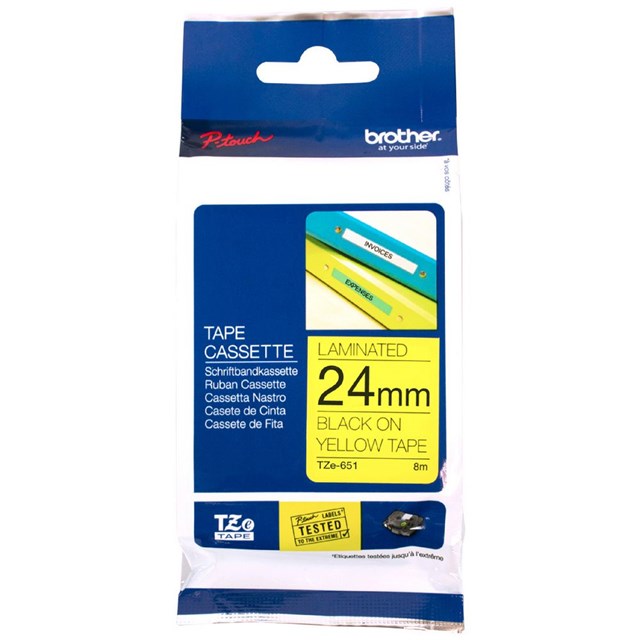 The Brother TZe-651 24 mm x 8 m Black on Yellow Tape is perfect for restocking your Brother TZe label maker