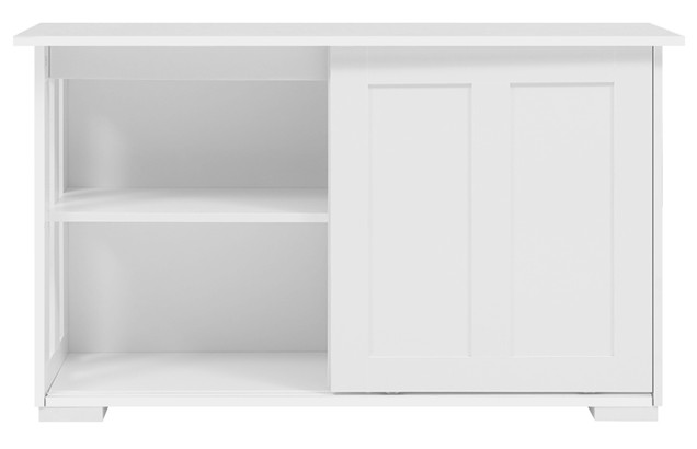 The sideboard comprises a countertop and two large shelves within a two-door cabinet.