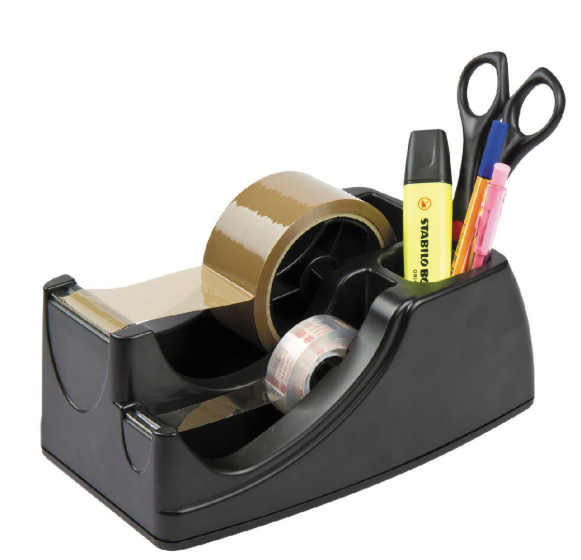 Made from 30% post-consumer recycled material Weighted base allows for easy one-hand dispensing of both packaging and general-purpose tape Accommodates a roll of 50mm packaging tape and 19mm general-purpose tape Features a compartment for pens, pencils, and scissors Ideal for mail rooms, shipping departments, and sample rooms Tapes and other accessories shown are sold separately