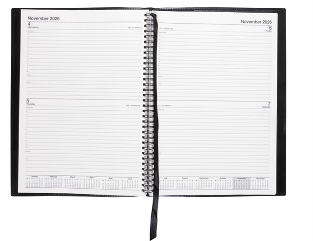 The 2026 Norwich A4 Black Diary is a spiral-bound planner with a flexible leather grain cover, featuring a 2 days to a page layout with 1-hour appointment slots from 8am to 6pm, Monday to Sunday