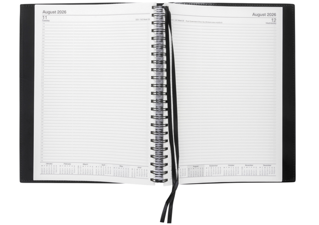 "Diary 2026 Norwich A4 Day to a Page Black" refers to the Cumberland Norwich diary, a spiral-bound, black, A4-sized desk diary for the 2026 year with a Day-to-Page layout
