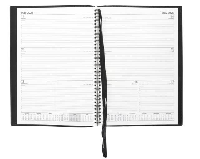 The Cumberland Norwich A4 Week to a View Black diary for 2026 is a spiral-bound, black leather grain diary designed for planning and appointments