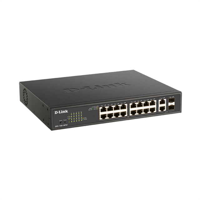 18-Port Gigabit Smart Managed PoE Switch with 16 PoE+ and 2 Combo RJ45/SFP Ports (130W PoE budget), designed for SMB's who expect a lot of their network, including support for surveillance and VoIP