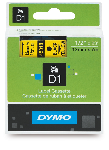 Dymo D1 Label Tape Black on Yellow 12mm x 7m Each