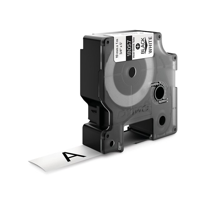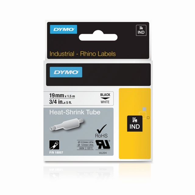 Dymo Rhino Indstrial Heat Shrink Tube 19mm Blk/Wht is made of industrial grade polyolefin and features a 3:1 heat shrink ratio for printing on tubing