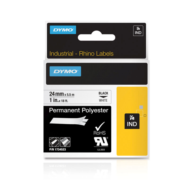 Dymo Rhino 24mm Permanent Polyester Tape is used for labeling panels, blocks, faceplates, shelves, bins, beams and more
