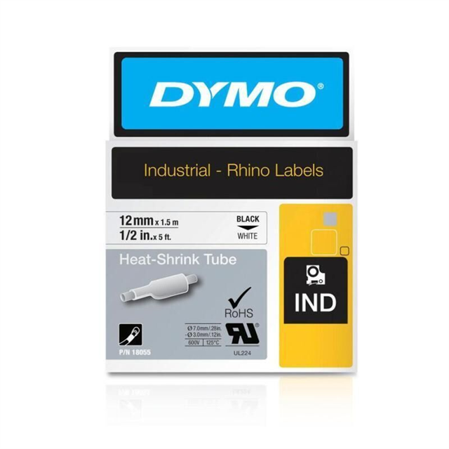 Dymo Rhino Indstrial Heat Shrink Tube 12mm Blk/Wht is made of industrial grade polyolefin and features a 3:1 heat shrink ratio for printing on tubing