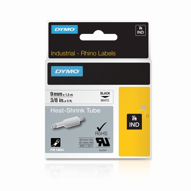 Dymo Rhino Indstrial Heat Shrink Tube 9mm Blk/Wht is made of industrial grade polyolefin and features a 3:1 heat shrink ratio for printing on tubing
