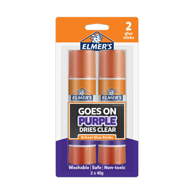 Elmers Disappearing School Glue Sticks 40G Pk2 Bx6 are great for kids! Purple colour is easy to see when applying, but dries fast and colourless