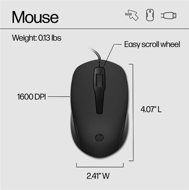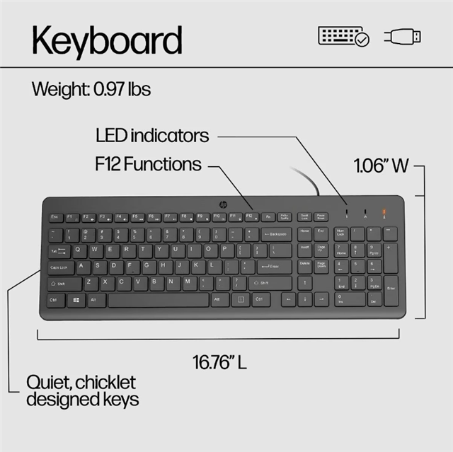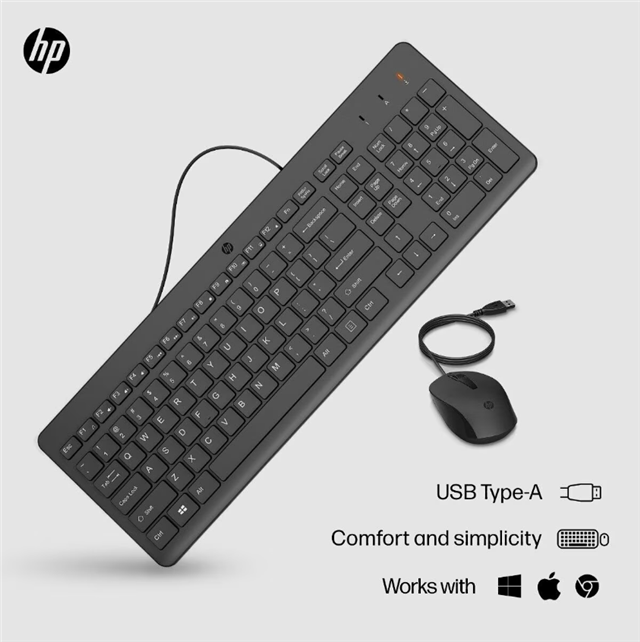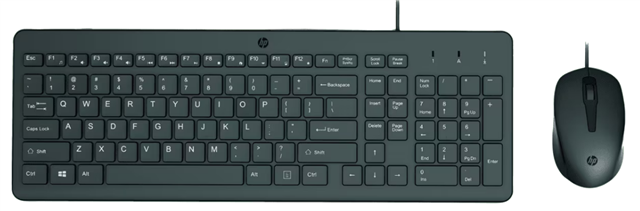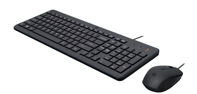 The HP 150 Wired KBM Kit includes a full-size keyboard with a numeric keypad and a precise wired mouse, providing a complete input solution for daily computing tasks