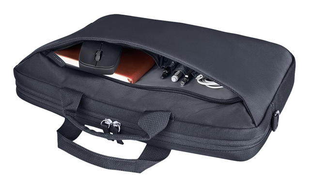 It features multiple compartments for organized storage of accessories and documents, padded protection for your device, and a comfortable carry handle and shoulder strap