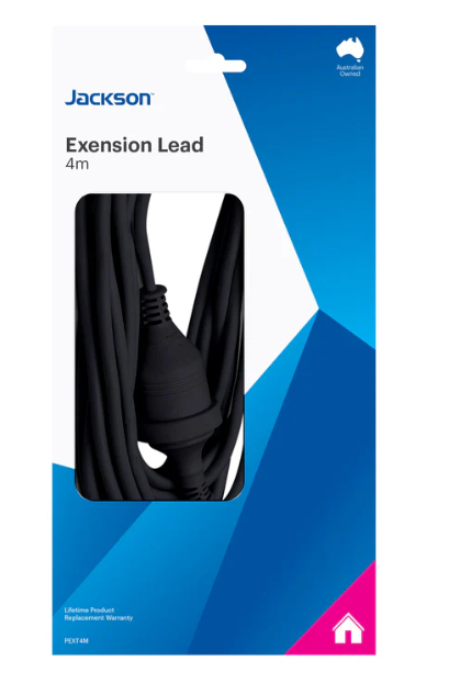 A Jackson Extension Lead 4m Black is a 4-meter long, black, power extension cord