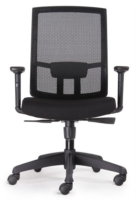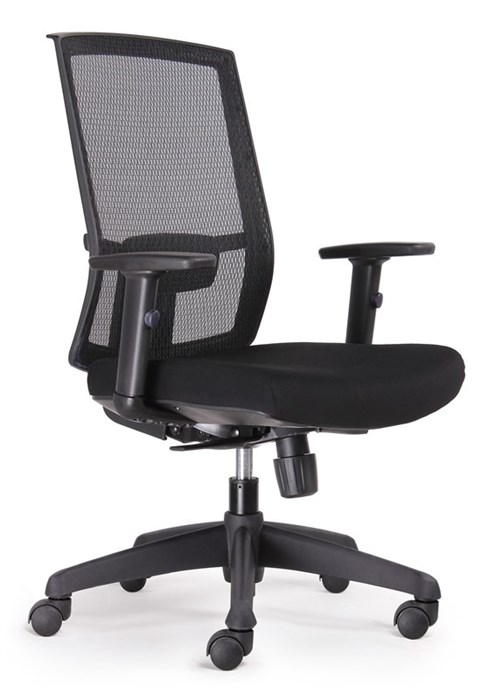 Promesh High Back Chair - Black Fabric Synchro Mechanism with Gas Lift, Back Rest and Seat Pan Tilt Black Mesh Back Rest and Black Upholstered Seat Pan Adjustable Lumbar Support and Removable Adjustable Arms Black 5 Star Base On Castors 135kg Weight Rating BIFMA Tested GreenGuard GOLD Approved 10 Year Warranty