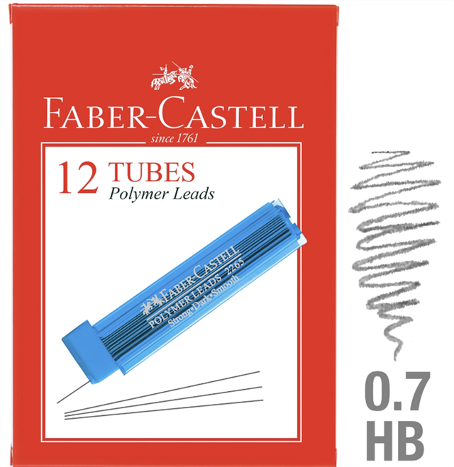 This pack includes individual Faber-Castell Polymer Lead Tubes that each include 12 leads with hardness degrees of HB and line widths of 0.7mm