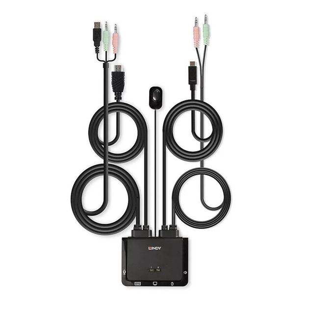 The Lindy 2 Port KVM Switch is a bus-powered desktop solution designed to share one keyboard, one mouse, and one monitor between two computers: one connected via HDMI and the second via a versatile USB Type-C port (supporting DisplayPort Alternate Mode)
