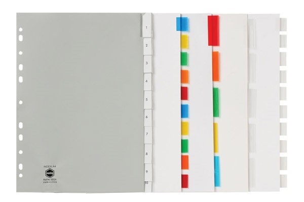 Grey polypropylene dividers with clear plastic tabs for frequent use.