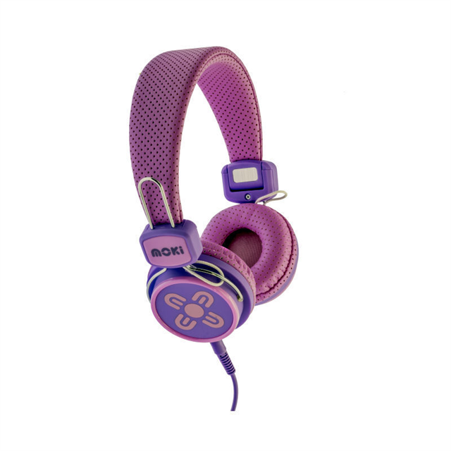 The Moki Kids Safe headphones in pink and purple are specially designed to provide **safe and comfortable listening** for children