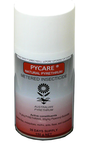 The Pycare refill delivers a metered mist of Australian natural pyrethrum insecticide at regular intervals which remains suspended in the air for the effective control of flying and crawling insects on contact