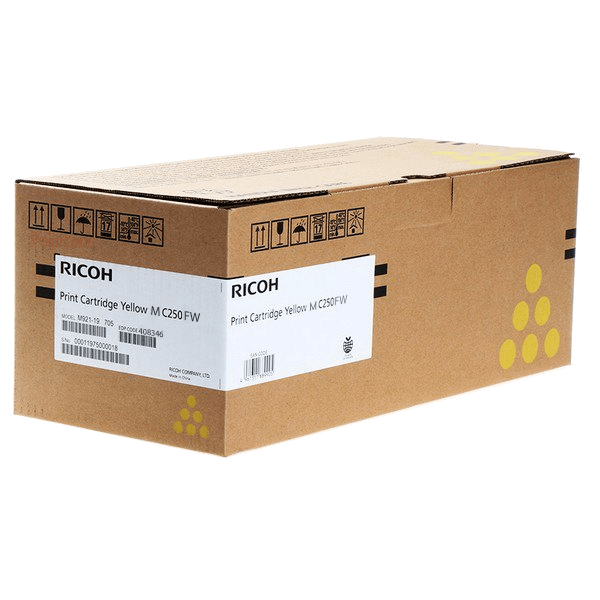 Genuine Ricoh MC250FW MC251FW PC301W Yellow Toner 408347 suitable for Ricoh M C250FW, Ricoh M C251FW, Lanier M C250FW, and Ricoh P C301W