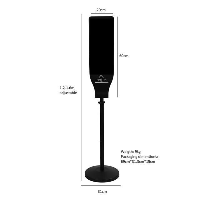 This automatic, no touch, hand sanitiser station is height adjustable from 1.2m to 1.6m and has a base diameter of 31cm