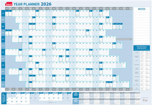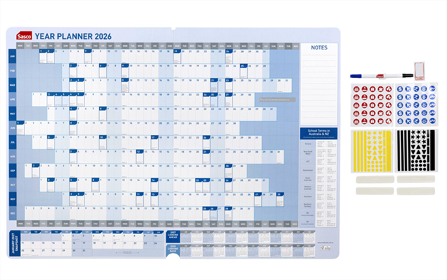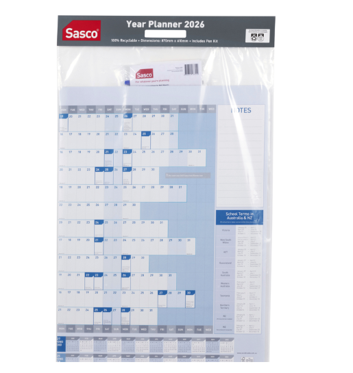 The Sasco 2026 Year Planner 10580 is a wall-mounted, write-on/wipe-off calendar that helps you plan the entire 2026 year with Australian and New Zealand public holidays and school terms marked