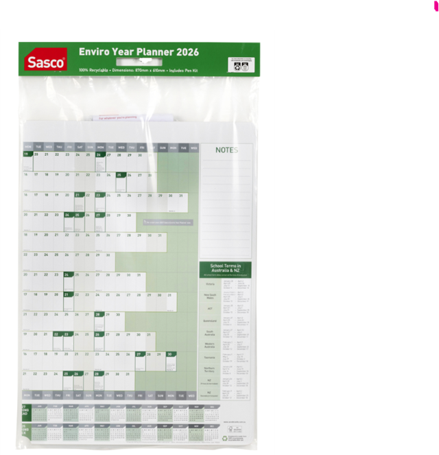 The Sasco 2026 Enviro Year Planner is a green, wall-mounted, write-on/wipe-off planner with a 610 x 870mm size, designed for planning the 2026 year with Australian/New Zealand public holidays and important dates