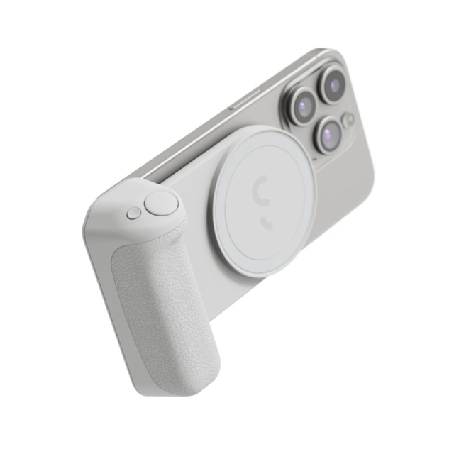 The ShiftCam SnapGrip Classic in Stone Grey transforms your mobile phone into an ergonomic camera, providing a comfortable hand grip for steady, one-handed shooting