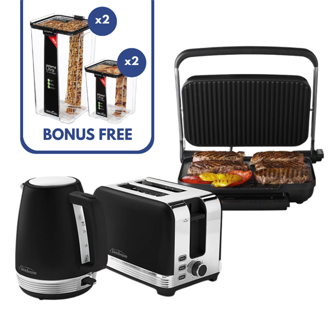 Get the Sunbeam & Sistema Complete Kitchen Offering Bundle with 4x FREE Sistema container for $250 ex gst for a limited time only valued at $330 ex gst! (while stock last) 1x Sunbeam The Chic Collection (Black) (0030010011) 1x Sunbeam 6 Slice Sandwich Press & Grill (0010023959) 2x Sistema 4L Ultra Square Large Container (0010032243) 2x Sistema 2.75L Ultra Square Large Container (0010032250)