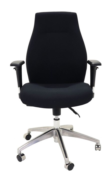 High Back Fabric Commercial Grade Chair High Grade Black Fabric Upholstery Infinite Tilt Lock Mechanism Chrome & Black Adjustable Arms Ultra Soft Foam, Gas lift, Chrome 5 Star Base On Castors 110 Kg Weight Rating 5 Year Warranty