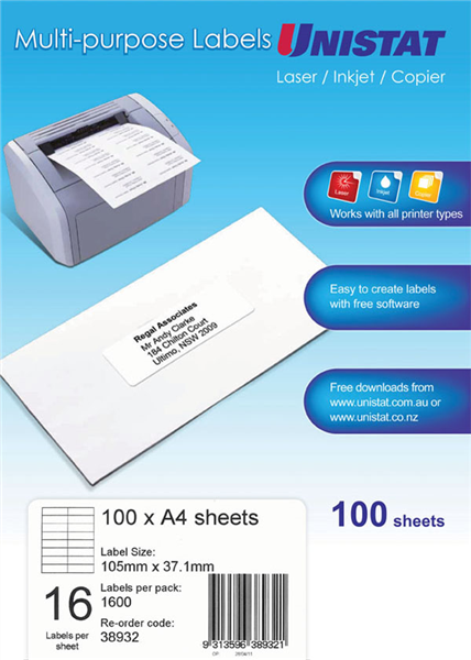 Unistat Multi Use 16UP Labels 100 Box Adelaide Direct Stationers