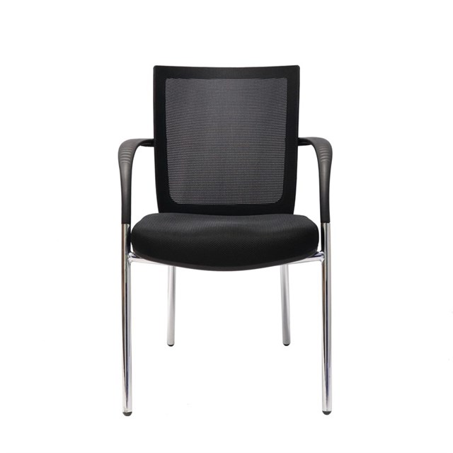 Mesh Back Visitor Chair - Black ASSEMBLED 4 Leg Chrome Underframe Black Mesh Back Rest - Black Upholstered Seat Pan Fixed Black PVC Arch Arm Rests 120 Kg Weight Rating 5 Year Warranty