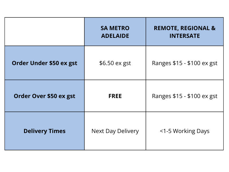 Deliveries outside the Adelaide Metropolitan area may be subject to delivery fees depending on location. Call us for information on freight charges outside of the metropolitan area. Goods being shipped to a destination outside of South Australia are generally dispatched from our warehouse within <1-2 working days on a courier.
